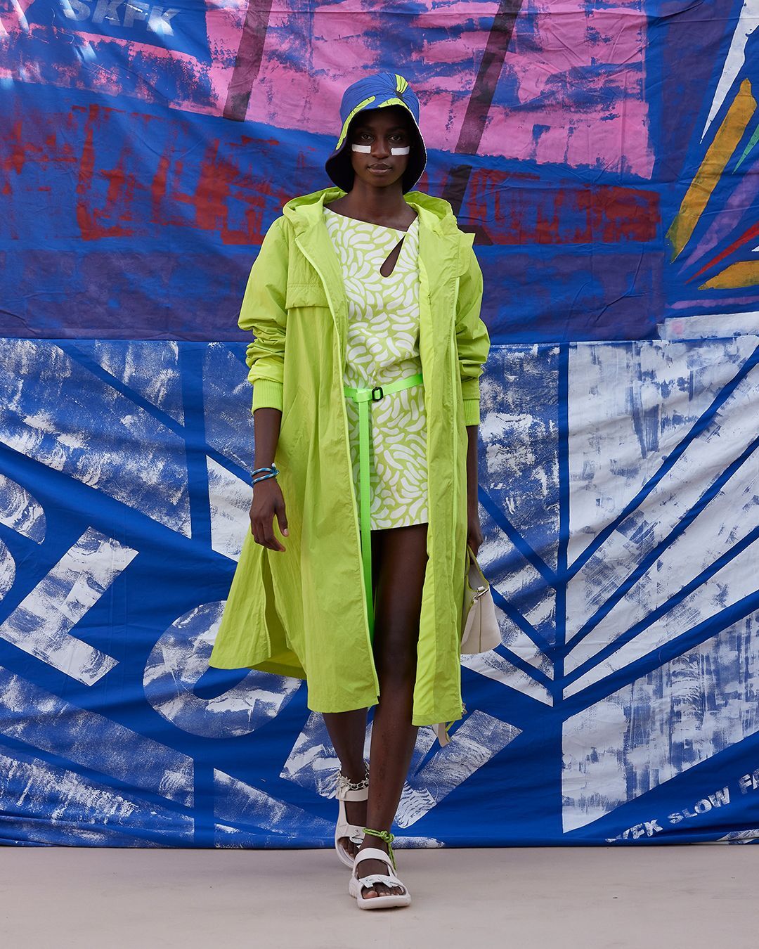 SKFK, eine junge spanische Marke, stellt Nachhaltigkeit in den Vordergrund: Biobaumwolle, Verzicht auf tierische Produkte und kurze Transportwege zeichnen die Marke aus. Freche Schnitte und kräftige Farben machen die Mode auf dem Laufsteg zu einem Blickfang.